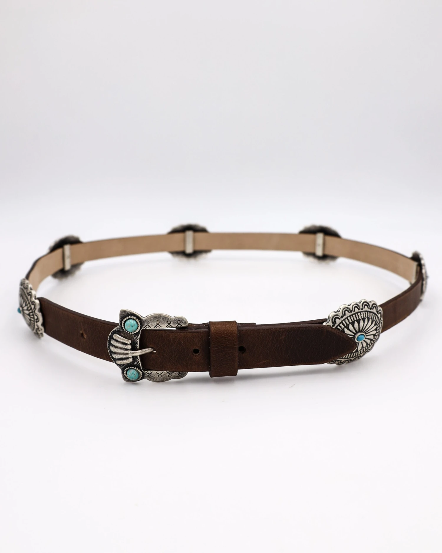 Our Concho With Turquoise Stones Belt Belt is detailed with antique silver conchos and turquoise stones