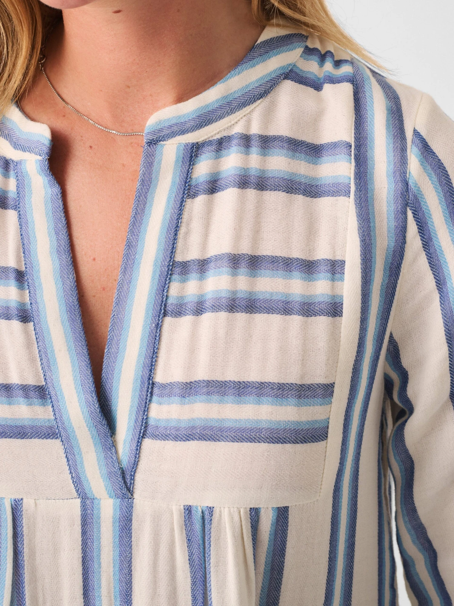 - Detail: Custom yarn-dyed stripe. Front bib with shirring. Contoured collar band with overlapping front placket. Bell sleeve with slight shirring. Tiered skirt with ruffles at each tier.