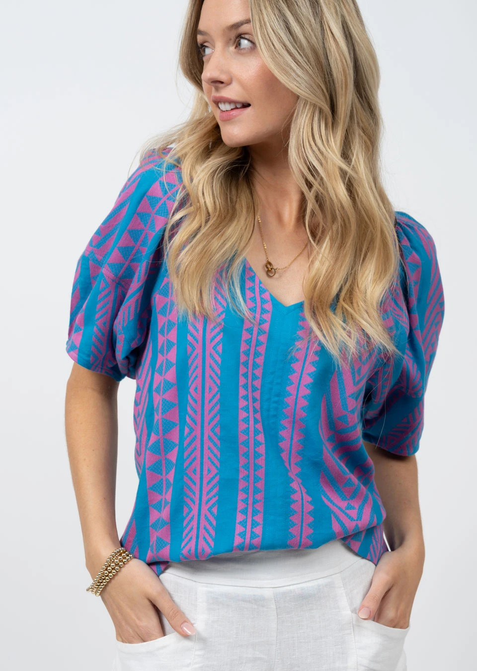 Get ready to feel the breeze of summer with Ivy Jane’s Lantern Top! This unique boho style top features an eye-catching geometric print in a lovely blue and pink combination. The slight balloon sleeves look so luxurious and comfortable, ready for an outdoor party or stroll through downtown. Plus, this baby is perfect for keeping cool – its lightweight fabric means you won’t have to worry about feeling too hot. Have fun and get styling this season!