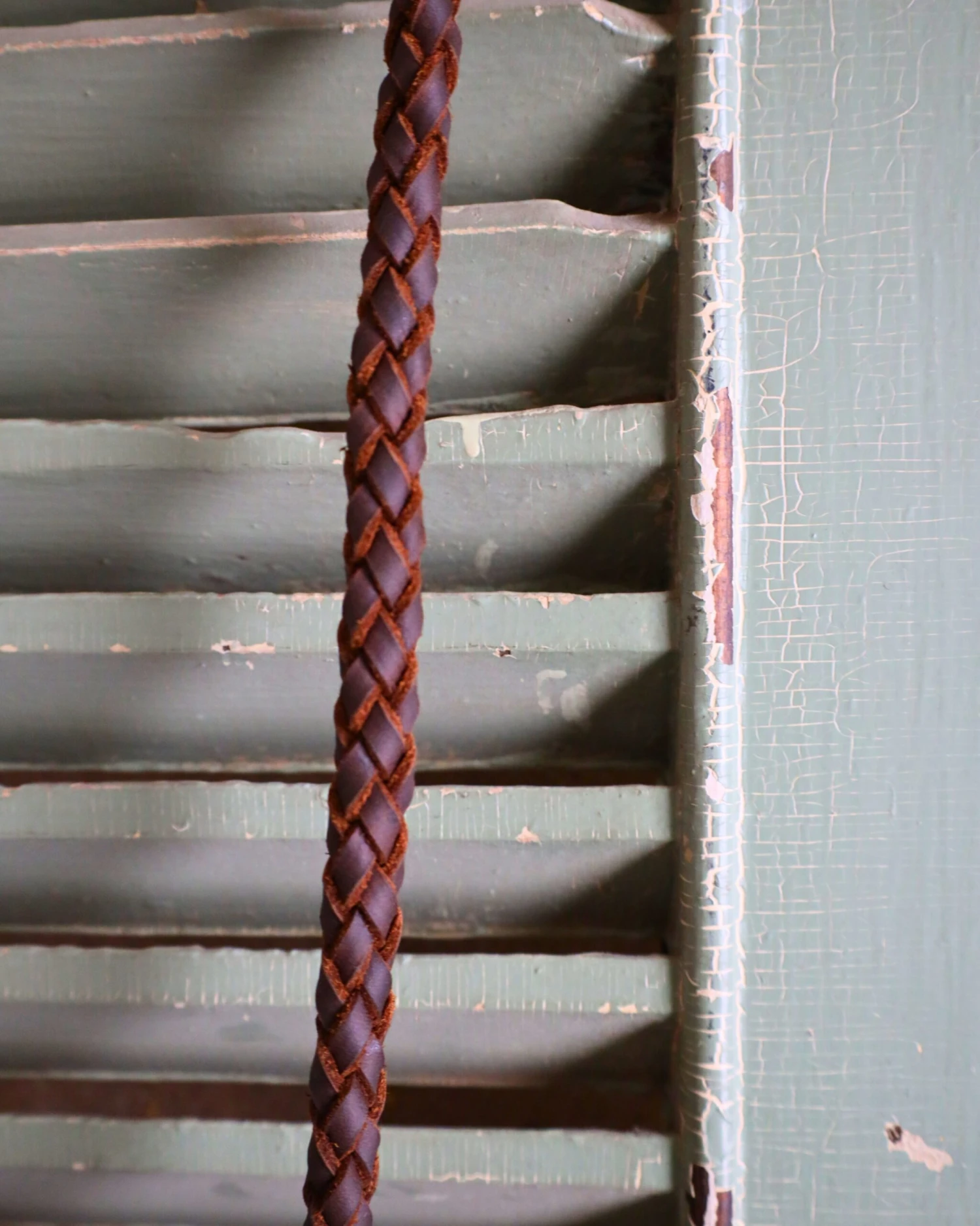 The strap is hand braided and attached at a standard of 48”. The strap is braided round into flat along the top to lay more comfortably across the shoulder.