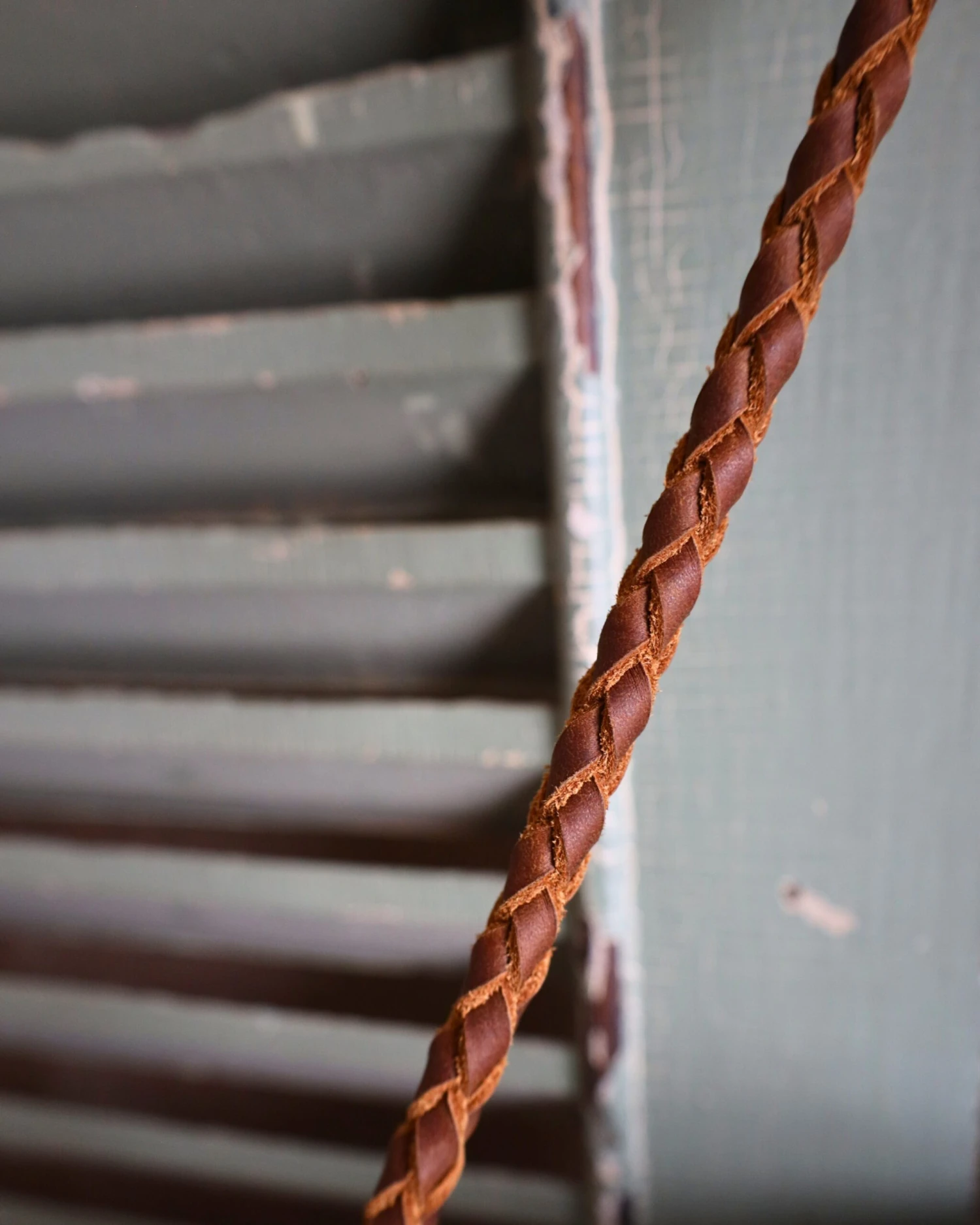 This bag is enhanced in our signature Camel leather braidwork and embellished with a 20ct Kingman Turquoise stone.