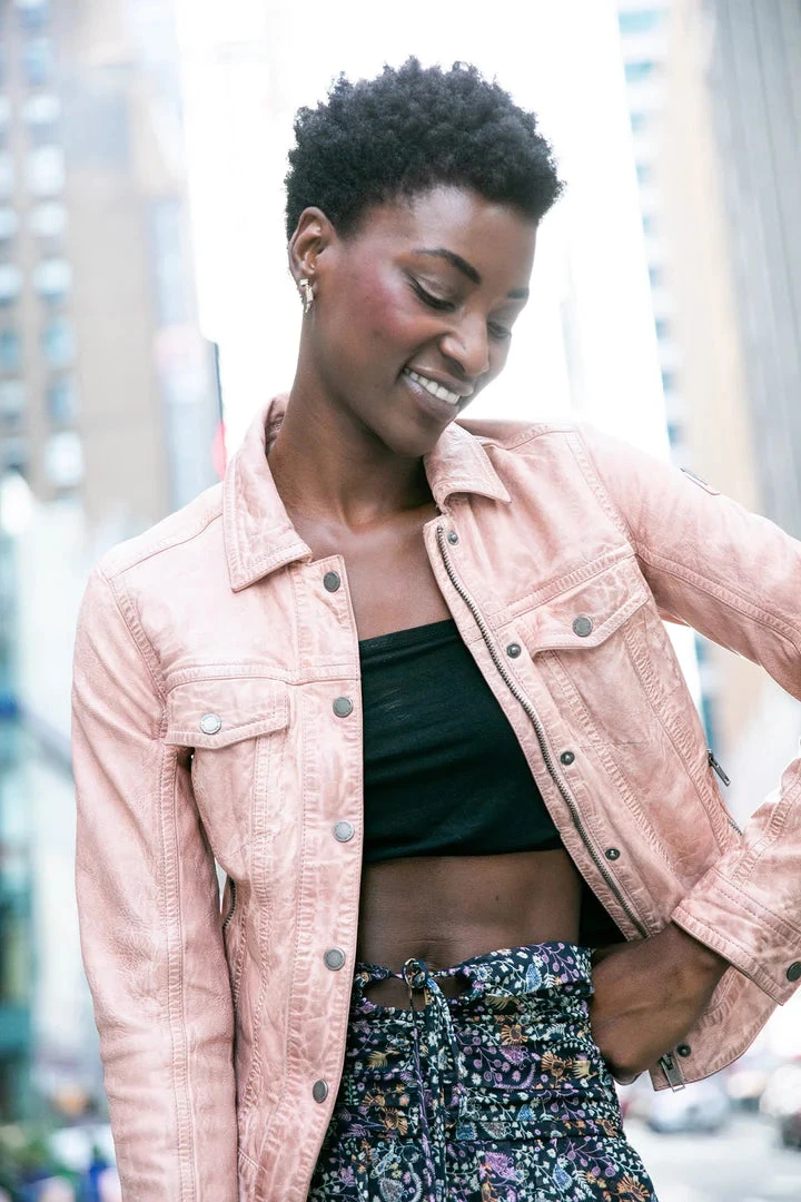 Our new version of the Jessie- a beautiful “denim” styled jacket, but in your favorite lambskin leather.