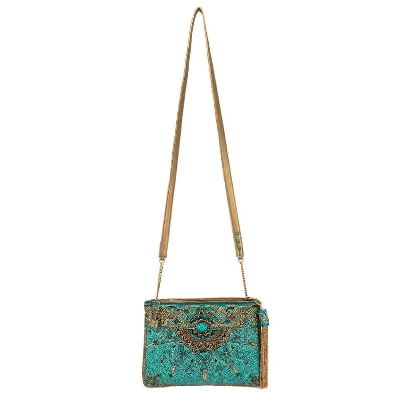 The natural Turquoise gemstones that represent wisdom, tranquility, and protection highlight this exquisite beaded crossbody handbag.