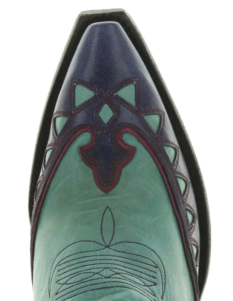 Stylish Aqua leather with bold western stitching details and antique silver studs accents. The beige undertone gives it its vintage used look. Deep scallop cut shaft, intricate stitching on the pull tabs – makes this boot all about details and a must-add boot to your Old Gringo Collection.