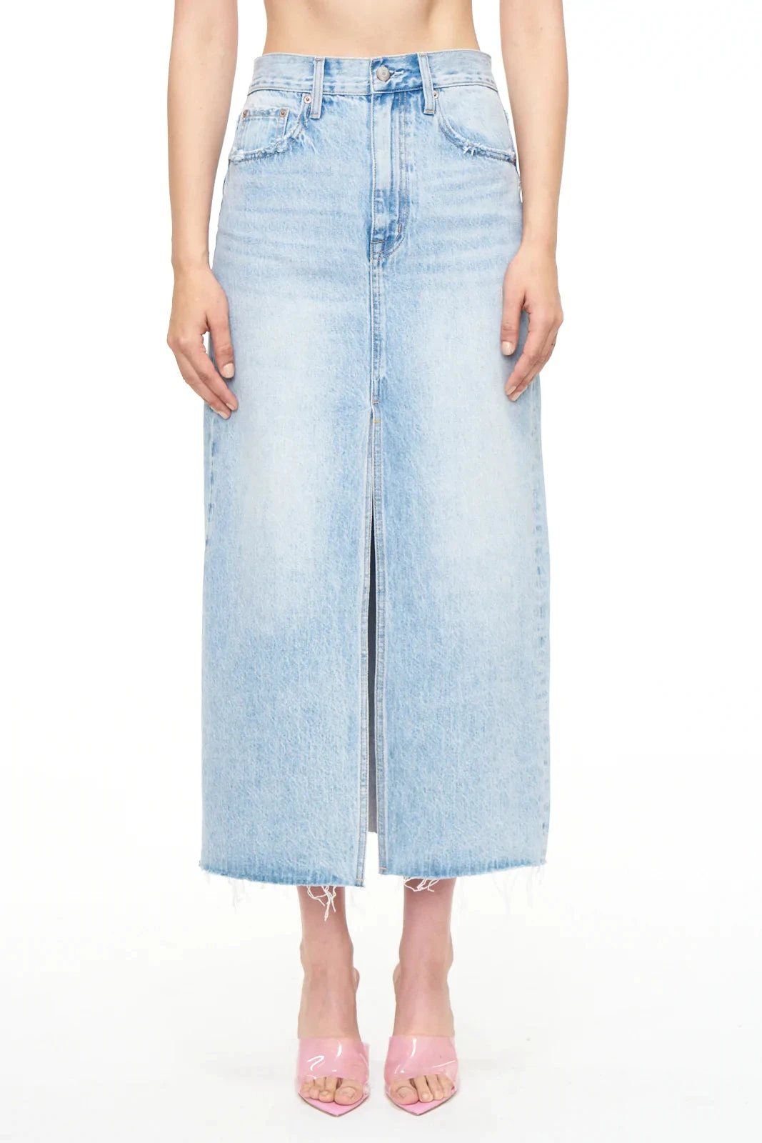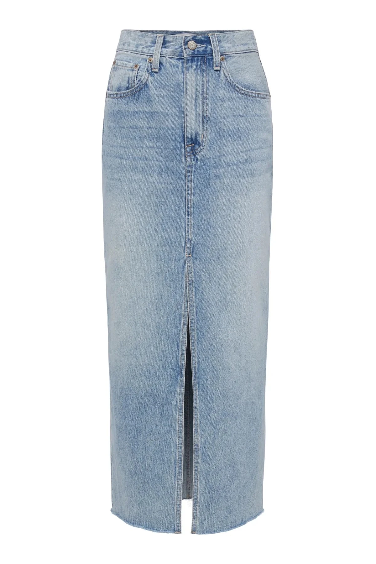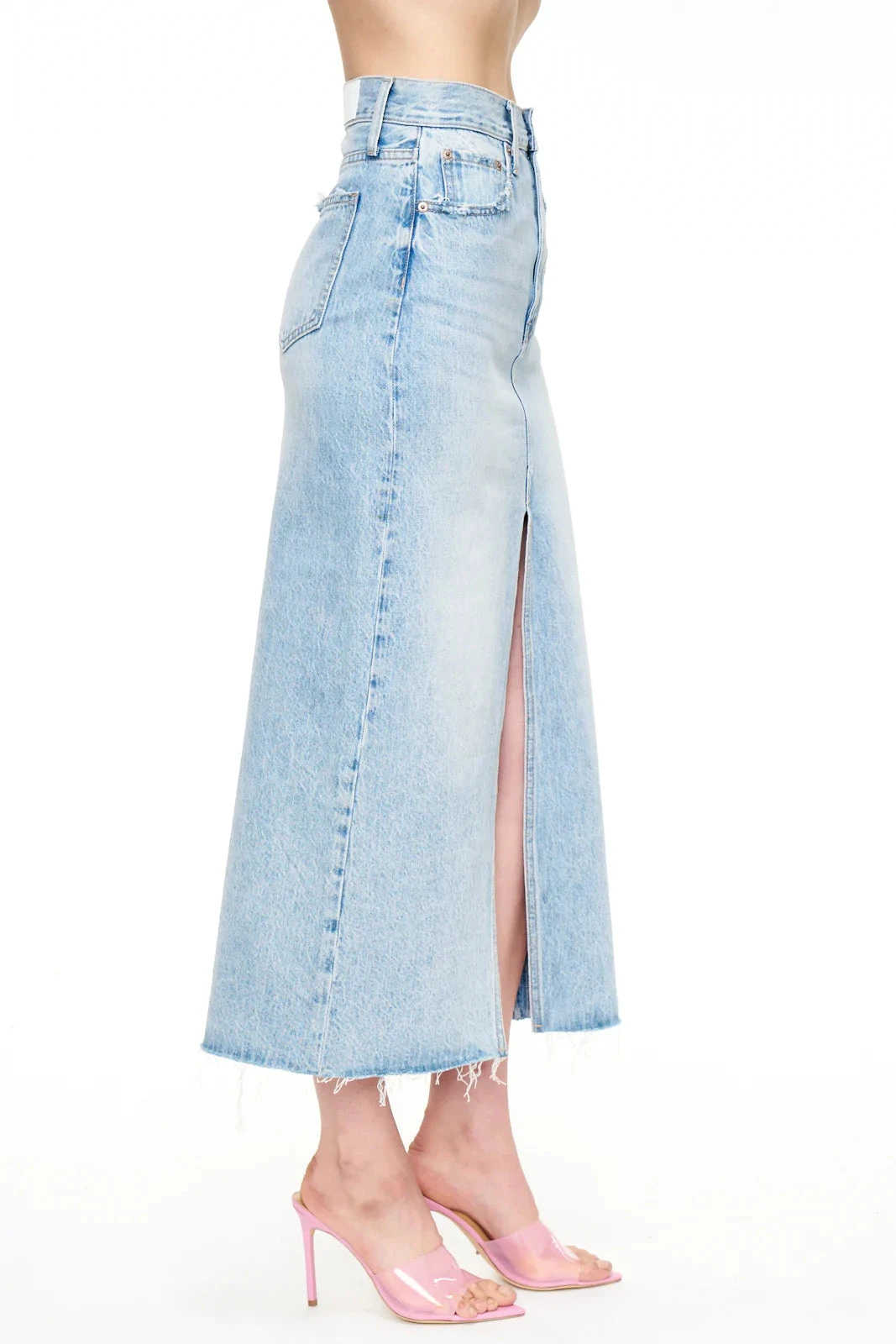 - Â The Alice denim midi skirt is designed with a front slit, raw hem and relaxed fit that’s designed to sit at the hipsÂ