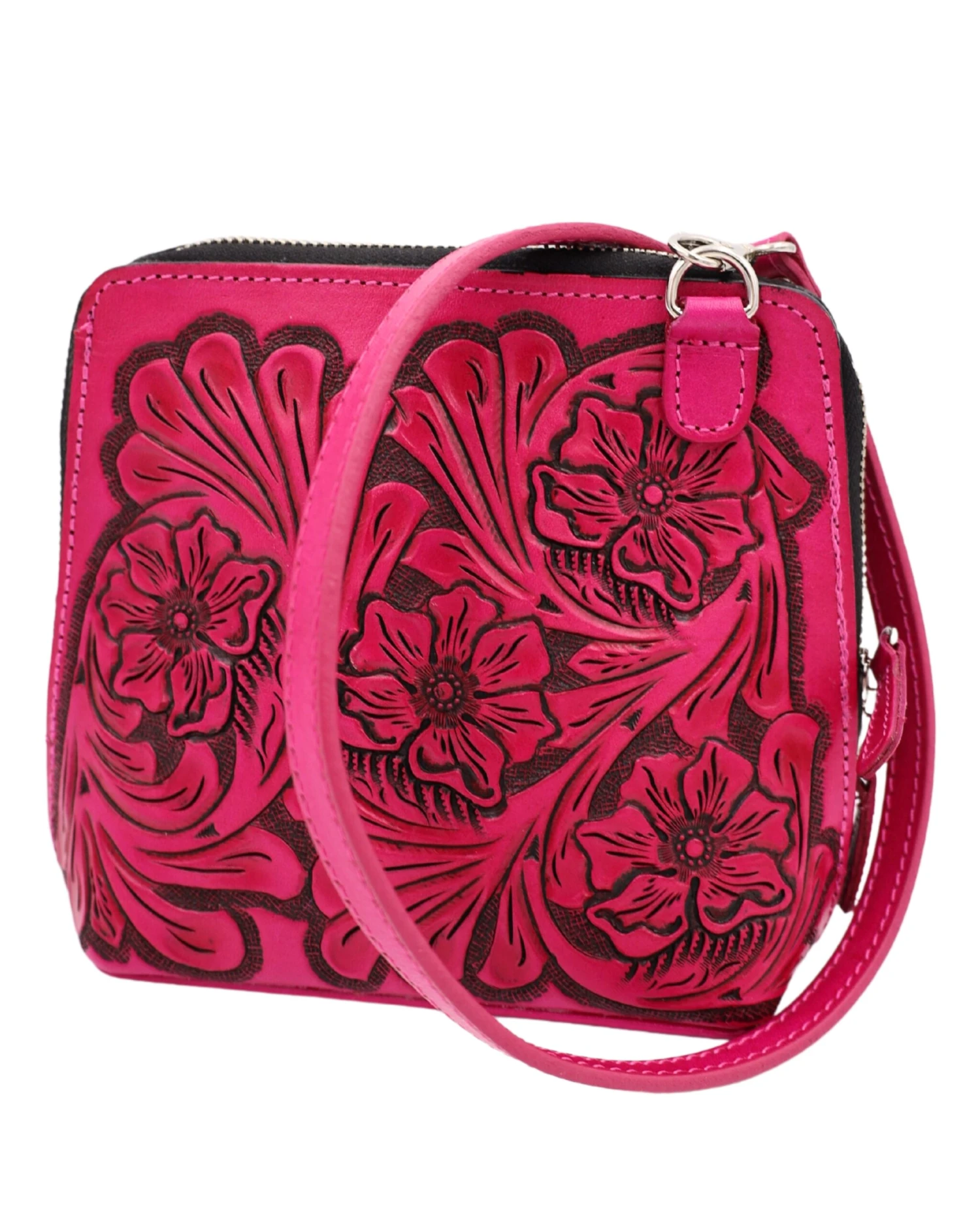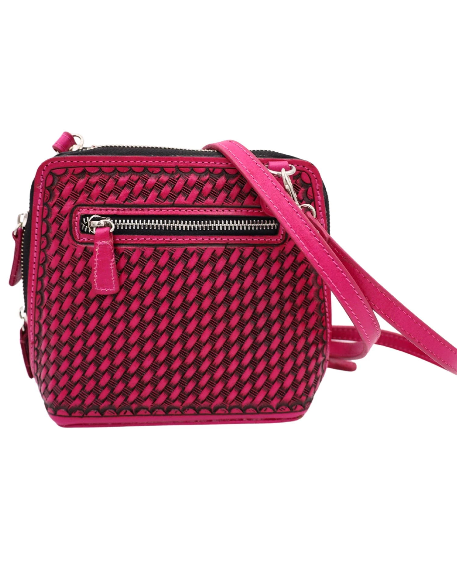 Made in Mexico, these handbags are the finest leather and tooling, in fuchsia shades, since Maverick Fine Western Wear LOVES turquoise! Workmanship and details a joy to behold! Square with attractive tapered shape of 8.5 x 7 x 3″ bag with cute 48″ cross body strap. One side has tooled basket weave texture and the other has traditional floral motif, with zip closure. Inside secure zipped pocket.
