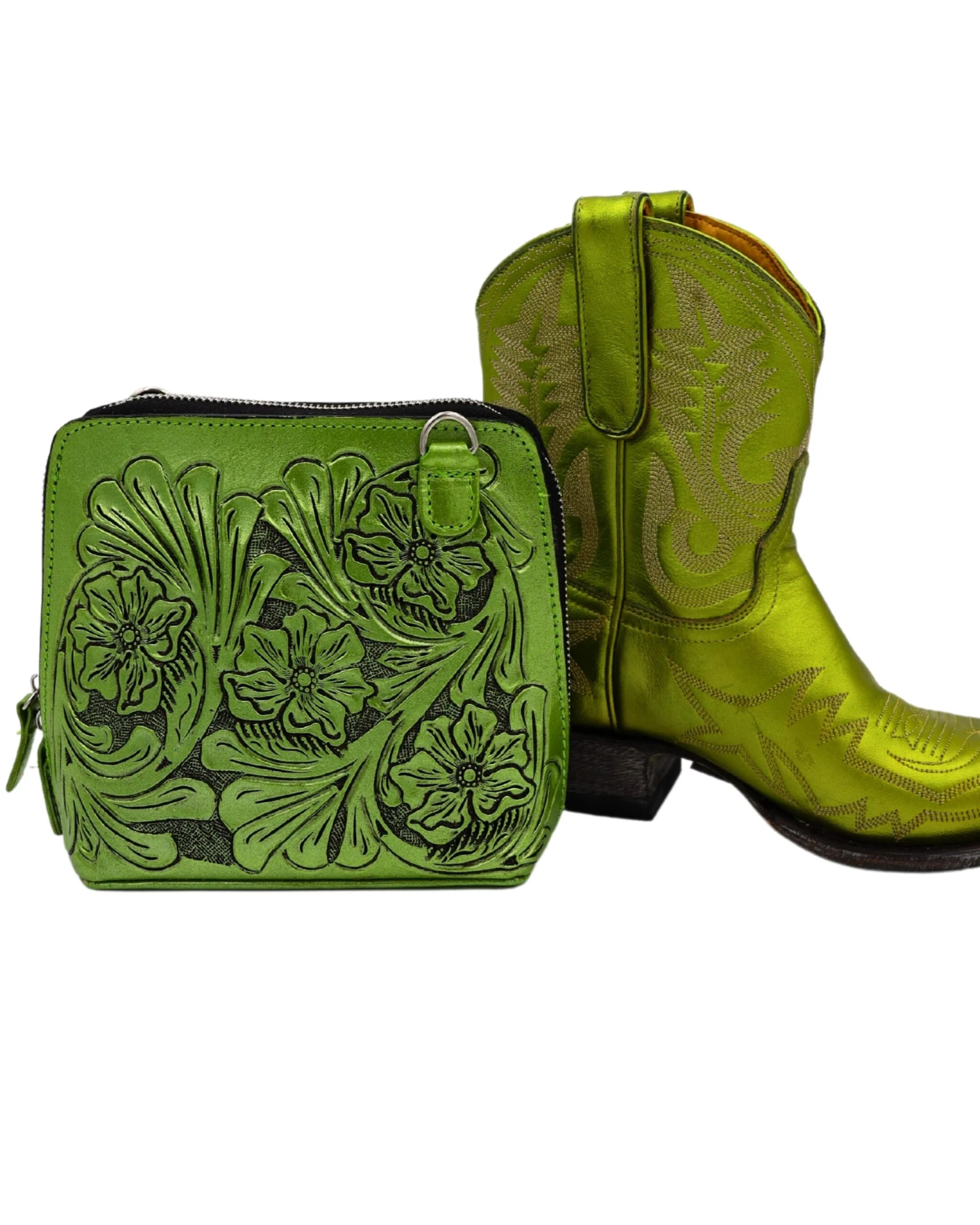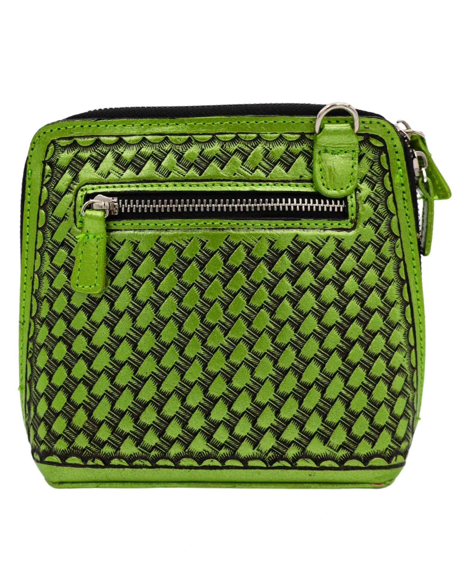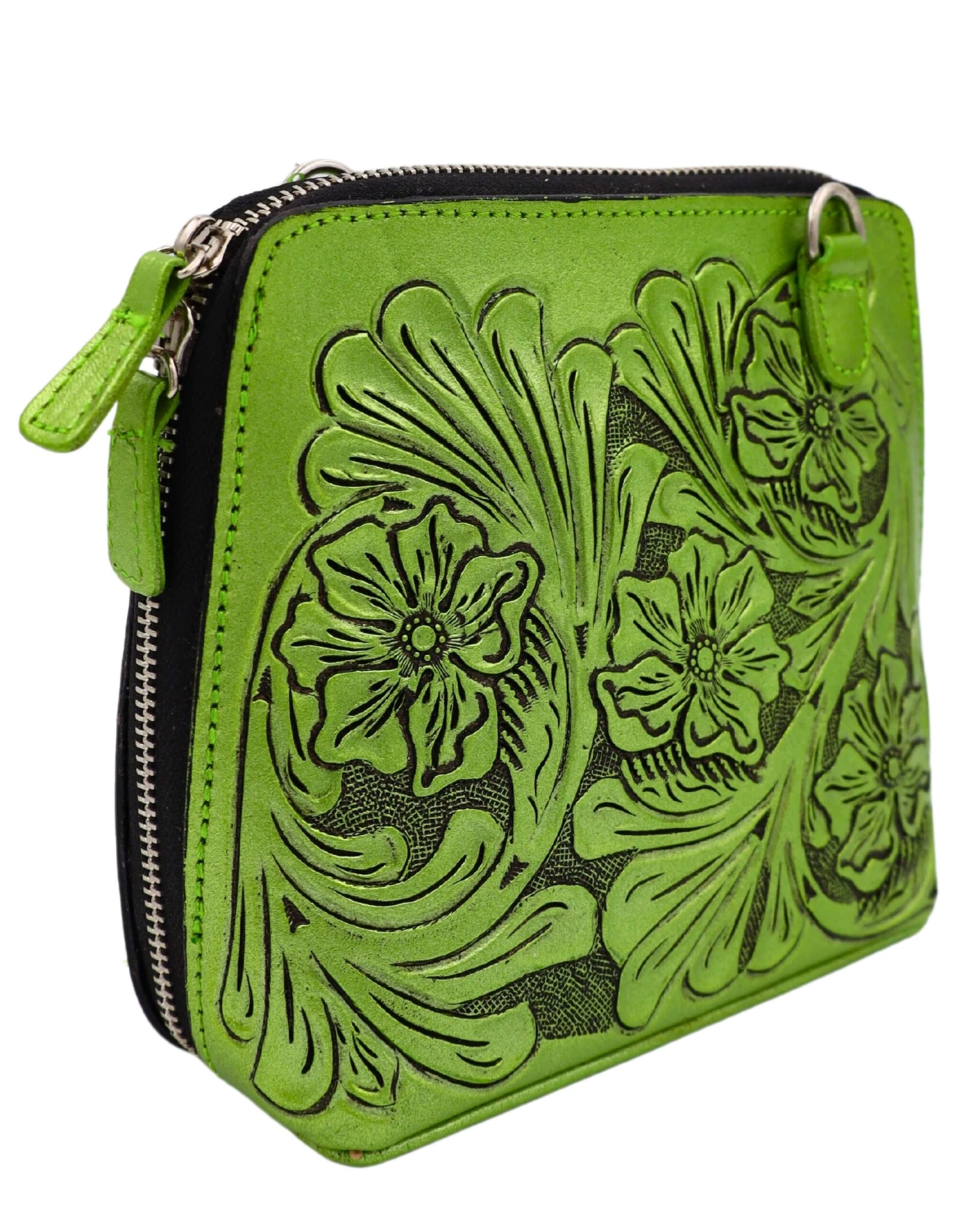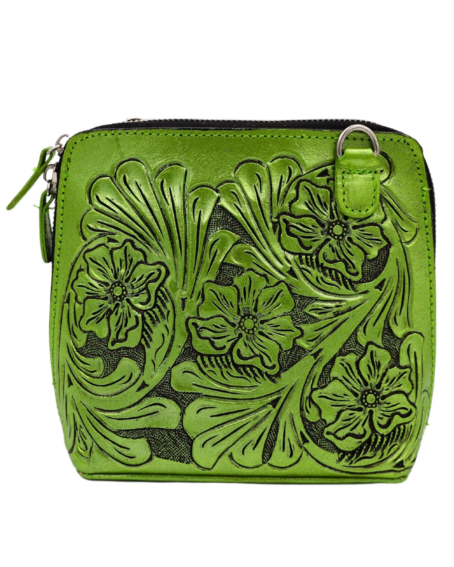 Made in Mexico, these handbags are the finest leather and tooling, in metallic green shades, since Maverick Fine Western Wear LOVES vibrant colors! Workmanship and details a joy to behold! Square with attractive tapered shape of 8.5 x 7 x 3″ bag with cute 48″ cross body strap. One side has tooled basket weave texture and the other has traditional floral motif, with zip closure. Inside secure zipped pocket.