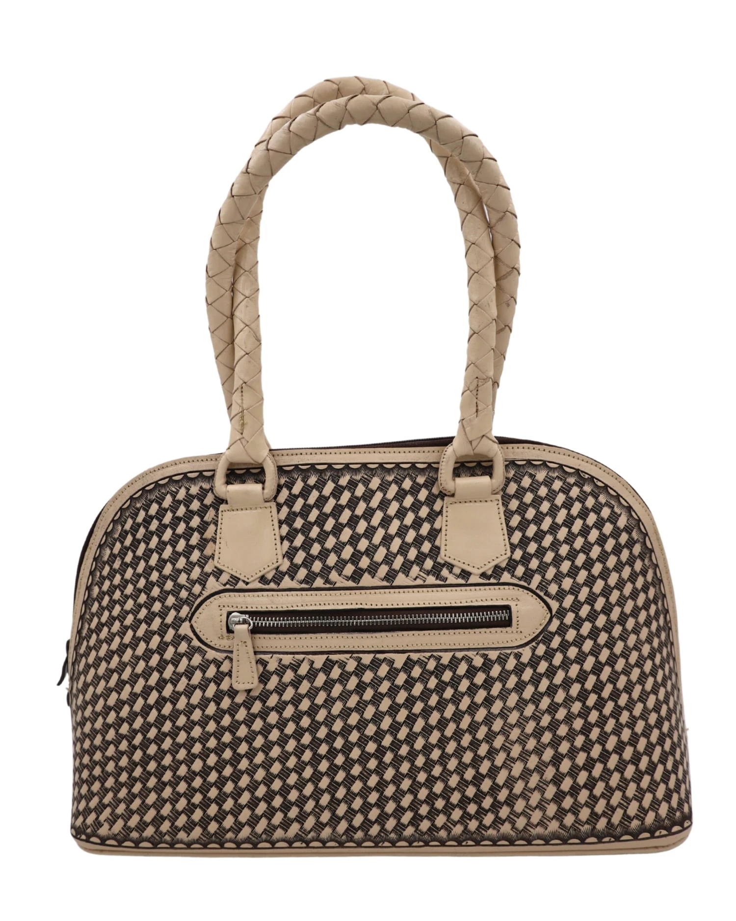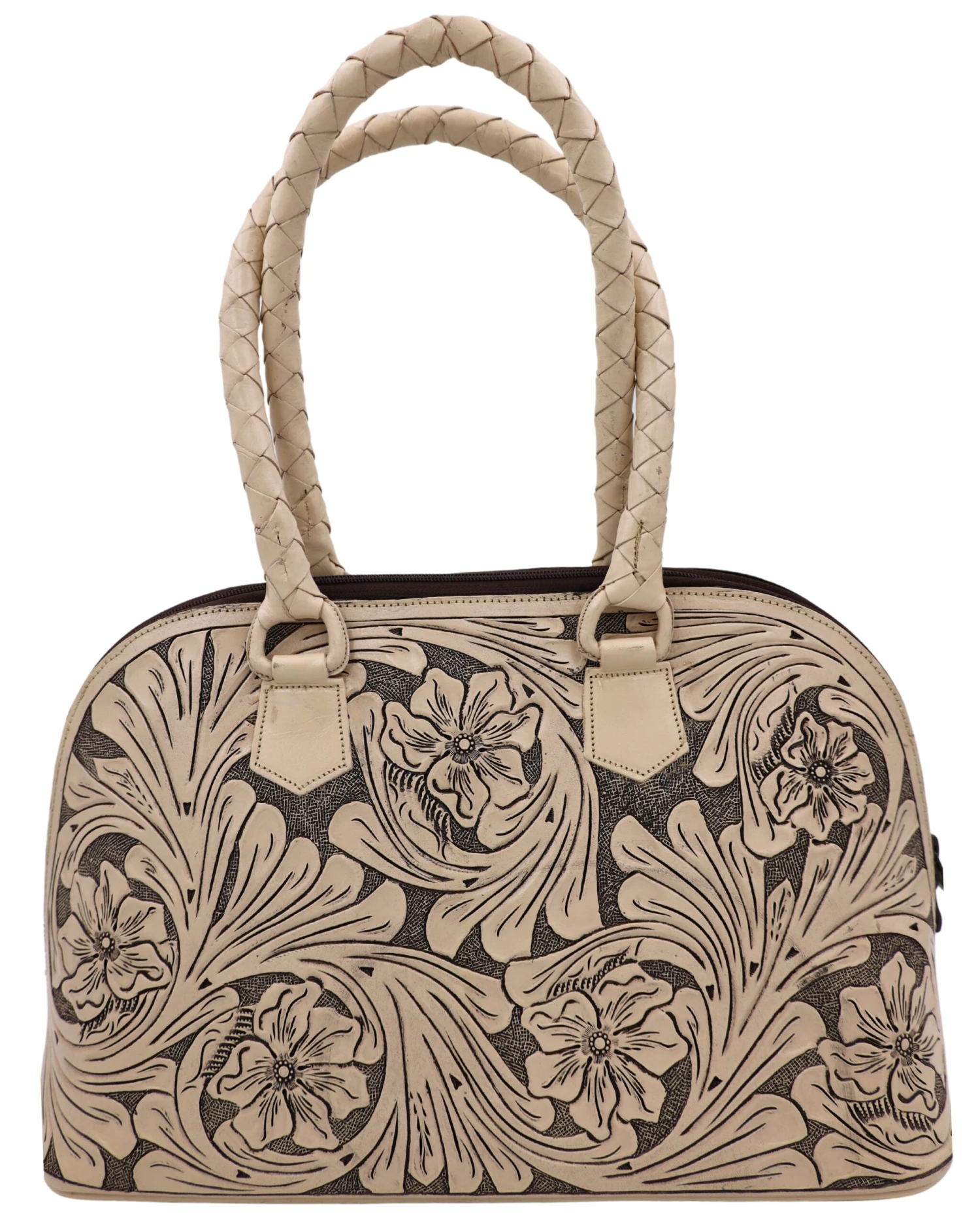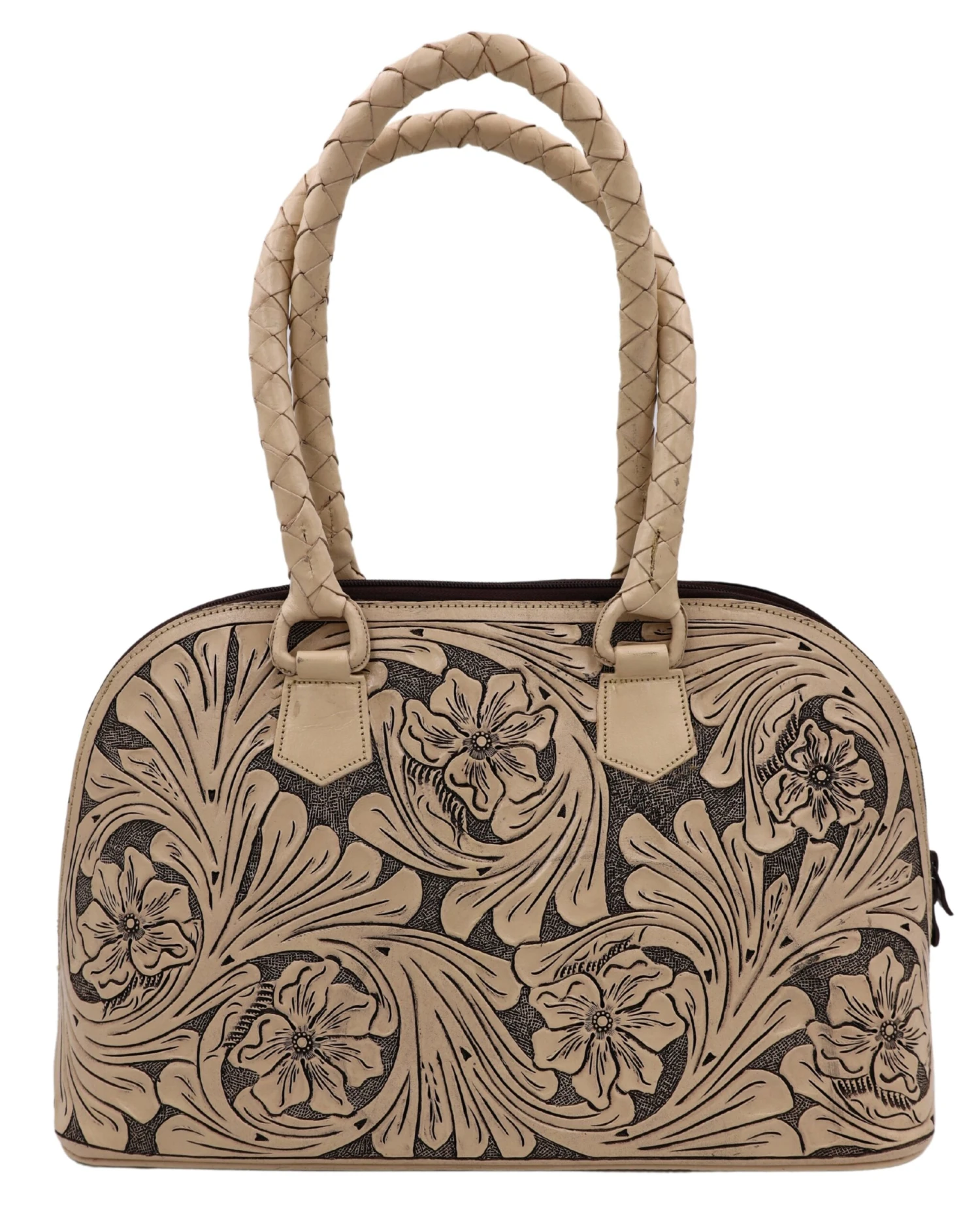 Que Chula! Malentin Mediano Purse – Que Chula can translate to “what a beauty!” Made in Mexico, these leather goods are the finest leather and tooling. Workmanship and details a joy to behold! We sure love leather and this sizable bag will get us our girly fix and function with plenty of room and style. Measures 16 x 10 x 6.5″ with fixed braided leather straps. Zip goes all the way around; bottom has six metal studs for feet. Inside has middle zip cloth section and side slots, one with a zip. One side is tooled with traditional florals, the other basketweave.Â