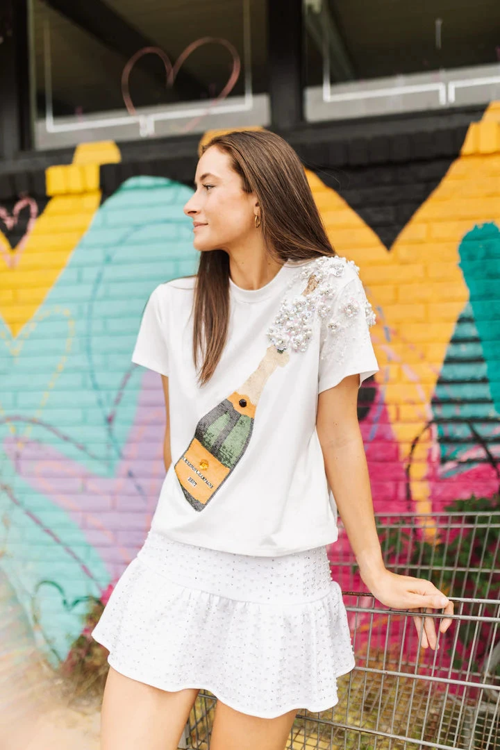 Celebrate in style with this fabulous Queen of Sparkles tee! An all white crew neck tee in a relaxed fit with sequined champagne bottle on the front and sequined bubbles mixed with pearls and floral sequins bubbling up and over the left shoulder. The perfect top for any celebration or when you just want to look sparkly and amazing.