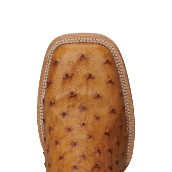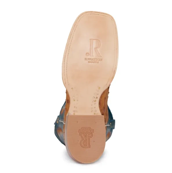 R. Watson Men’s 13″ Wide Square Toe Antique Saddle Brucciato Full Quill Ostrich with Royal Blue Cowhide Top, Double Stitched Leather Outsole with All Leather Block Heel and Full Cowhide Lining.