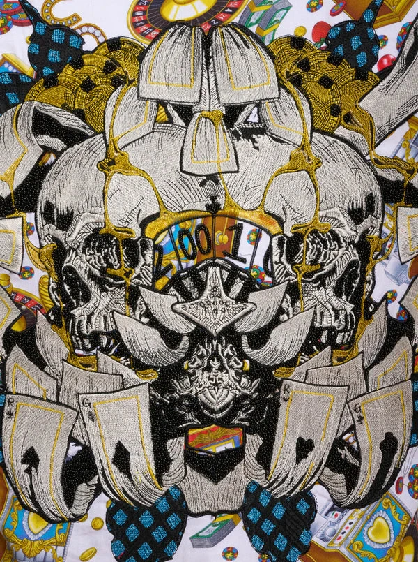 A kaleidoscope of gambling motifs and beading scatters across this allover print shirt in rich offbeat tones reminiscent of the hippie ’70s. From one-arm bandits and roulette wheels to atmospheric vestiges of Las Vegas tables, Lady Luck would swoon over this shirt, especially the gambling man emblem on back. #Flipthecollar and cuffs for a hands down winning look.