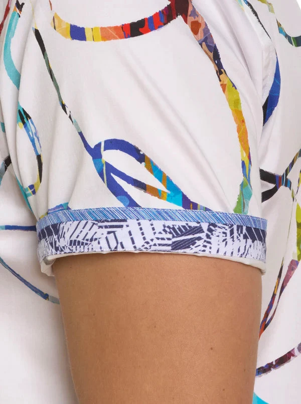 We don’t recommend you spend time tracing it, but this multicolor swirl pattern is amazingly in one continuous line that circles throughout this short sleeve shirt on a white ground.