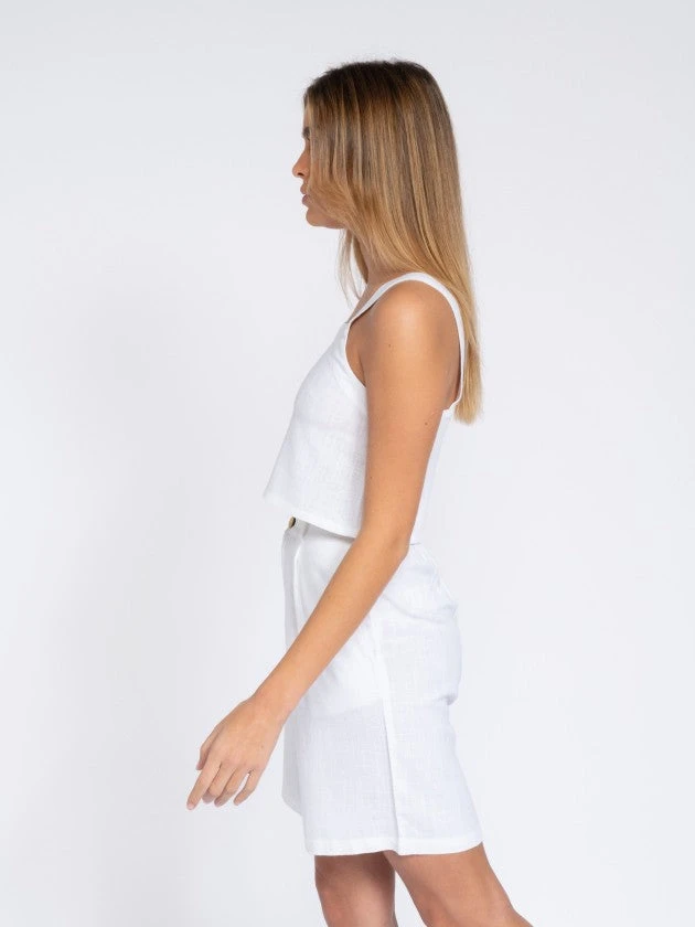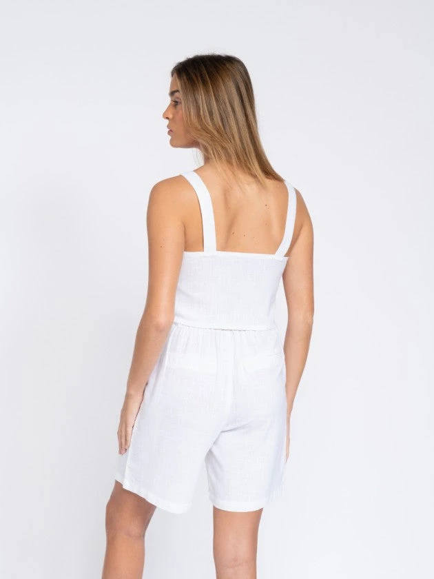Short linen top with linen shoulder straps.