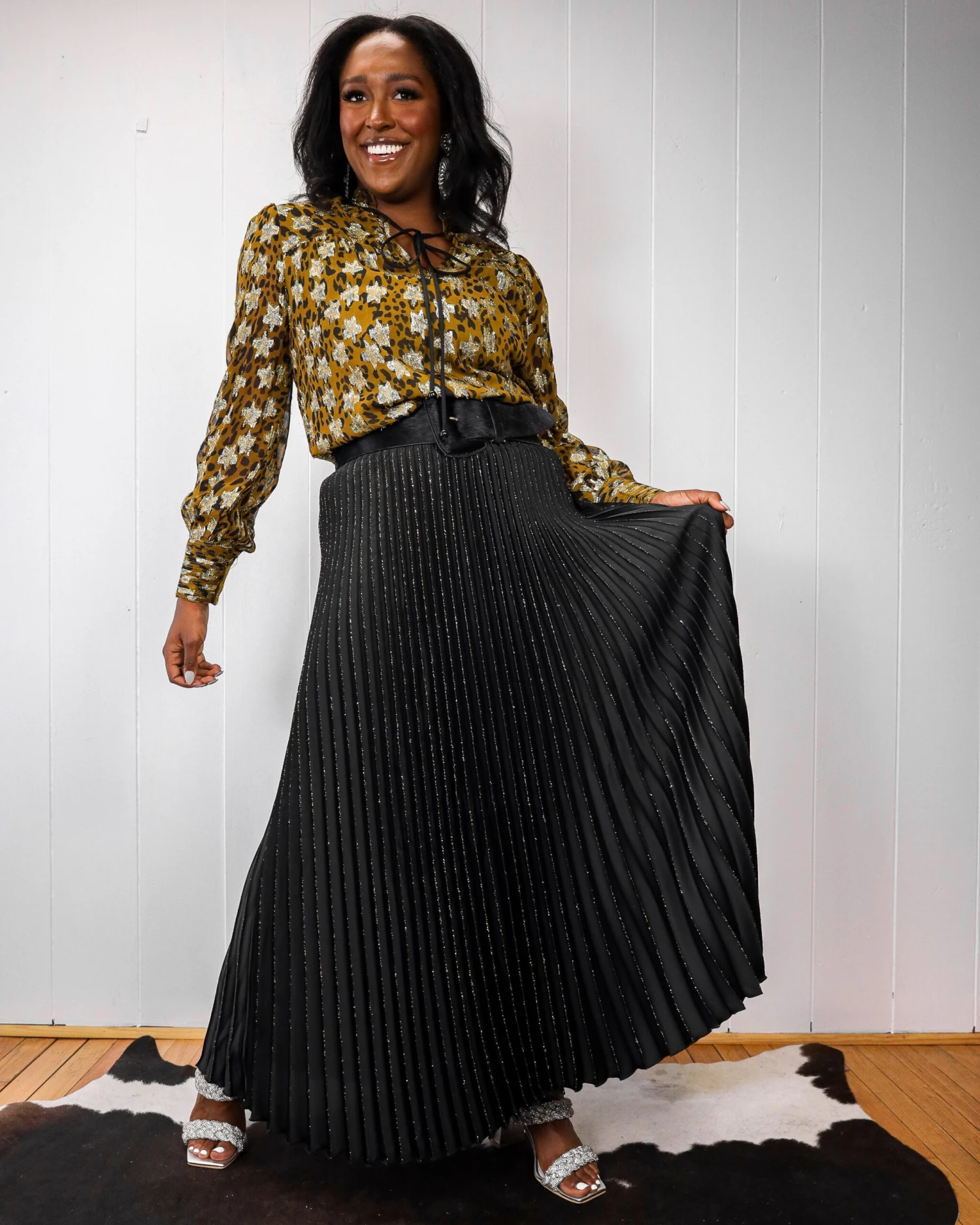 Black hair on hide belt with oversized hair on hide western buckle. Pair with your favorite skirt like Kirrah did using our Dixie Feather Edged Skirt or Berek Long Glittery Pleated Skirt to accessorize the Fine Western Wear way!Â
