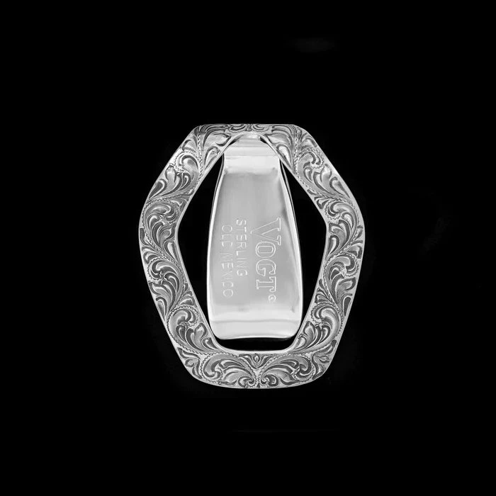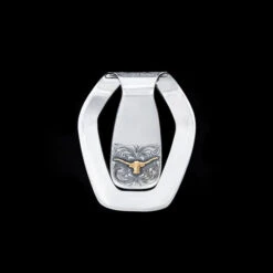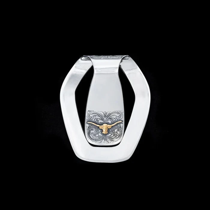 This brand new money clip calls to a classic cowboy symbol, the longhorn, with a sleek new design. The Bandera features a solid sterling silver fully hand engraved front and a polished back with a gold fill longhorn, framed with engraved scrolls. This functional money clip measures 2″ by 2 3/8″, and the open, lightweight design makes for a sharp, timeless look for the cowboy of yesterday and tomorrow.Â