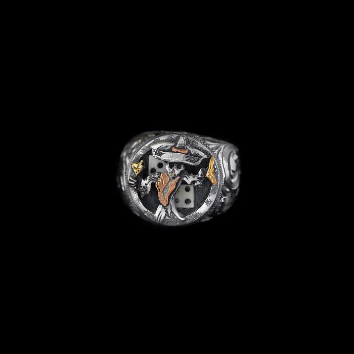 From the Cosmic Cowboy Collection, this hand engraved, antiqued sterling silver signet ring features the character Johnny Bones. His lapels are hand cut 14 karat rose gold fill and his six-shooter and martini glass are in 14 karat yellow gold fill. Measures 3/4″ long. The piece is accented with small antiqued dice cut in half and mounted in a sterling bezel, and the engraved scroll work wraps around the band.Â